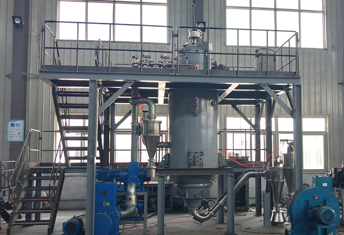 本設備由熔煉保溫室、霧化室、充氣系統、旋風除塵器、收粉罐、真空系統、充氣系統、水冷系統、液壓系統、電源及電控系統、工作平臺等組成。本設備為立式高架結構,地面布置有充氣系統,真空機組和收粉罐。